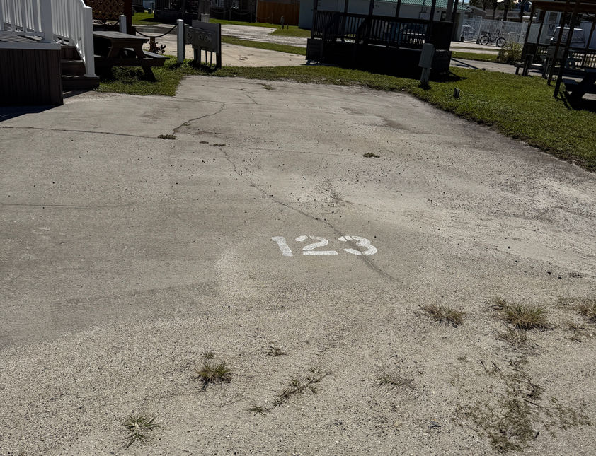 RV Lot # 123 for sale. Located at an end cap by the beach walkway and heated pool.
